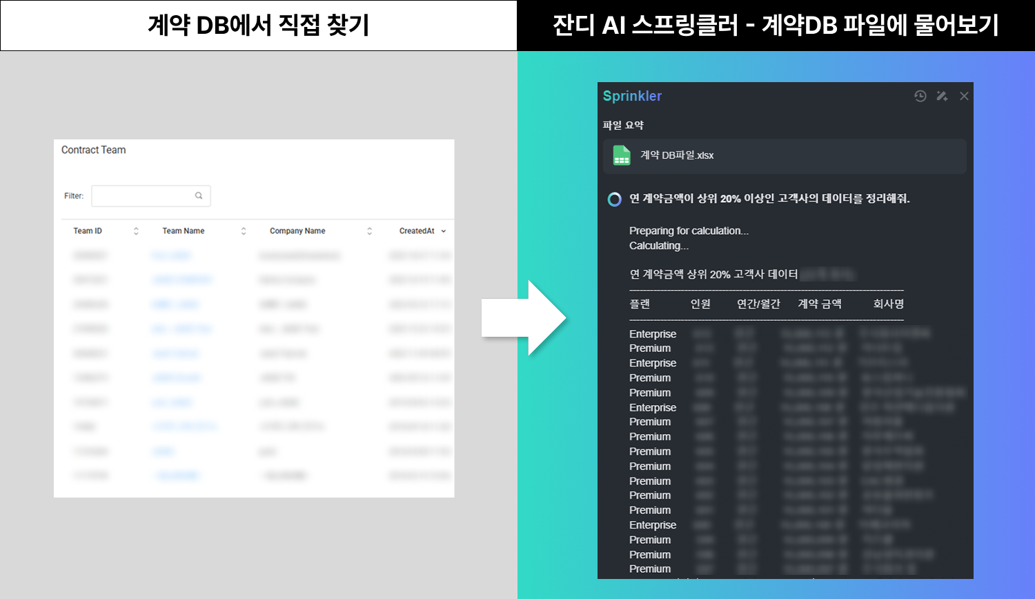스프링클러 사용 후: [잔디 AI 스프링클러 – 파일 요약]으로 한 번에 확인할 수 있게 되었습니다! 계약 데이터베이스를 엑셀로 추출하고, 스프링클러에게 필요한 내용들을 질문하면 즉시 찾아줘서 실수도 줄이고, 시간을 많이 절약할 수 있었습니다.