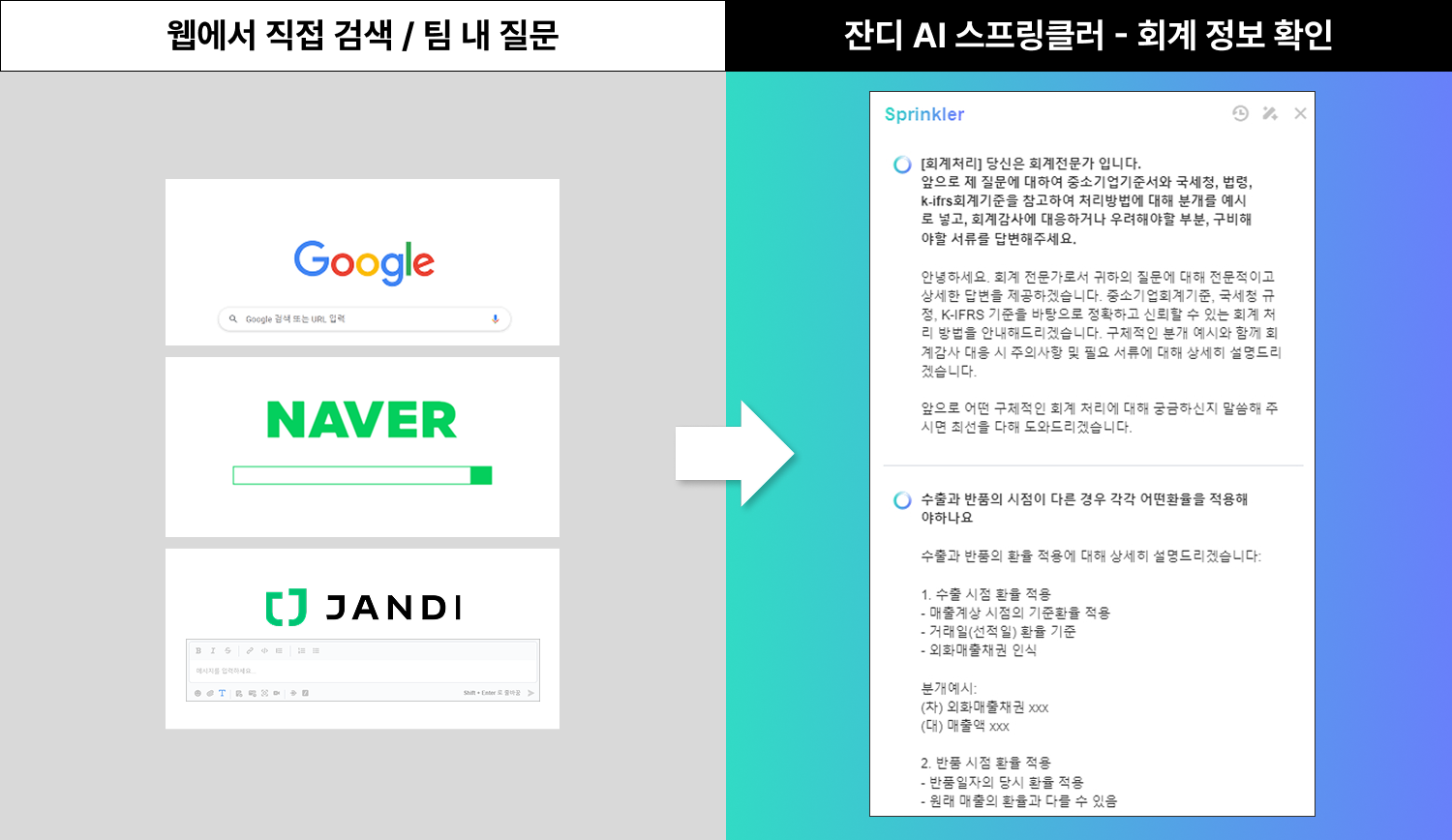 - 스프링클러 사용 전: 경영지원팀은 회계에 대한 내용 중 헷갈리거나 모르는 정보가 있을 때 매번 직접 찾아보거나 팀 내에 물어봐야 했습니다.