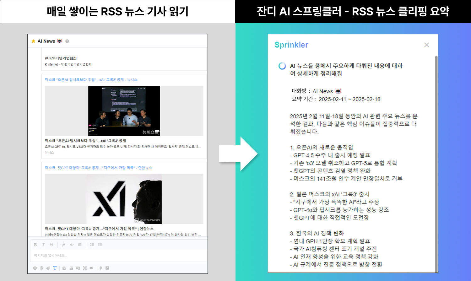 - 스프링클러 사용 전: 마케팅팀은 여러 콘텐츠를 제작하면서, 최신 트렌드를 반영하기 위해 다양한 RSS를 수신하고 있습니다. 다만 RSS로 모아진 최신 소식들도 결국 직접 하나씩 읽어야 했기 때문에 매주 시간을 들여야만 했습니다.