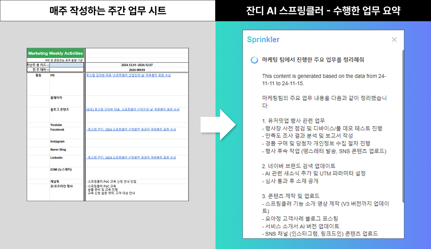 - 스프링클러 사용 전: 매주 월요일 지난 주 활동을 시트에 정리하고 회의를 진행합니다. 여러 업무가 동시에 진행되어 내용 파악과 수기 정리에 많은 시간이 들었습니다.