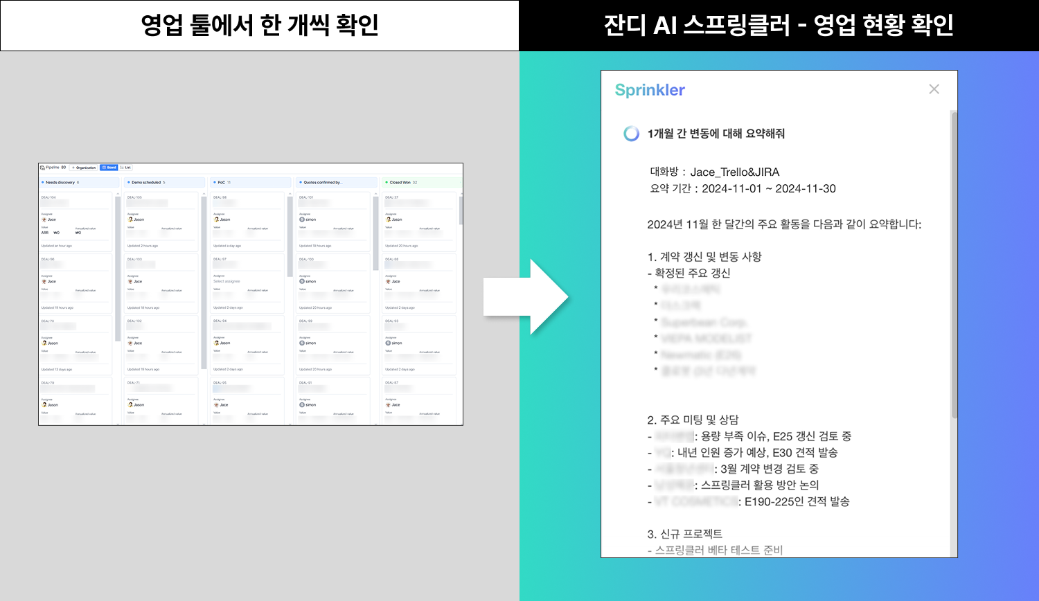 - 스프링클러 사용 전: 세일즈팀은 전화, 메일, 미팅 등 모든 영업 현황을 영업 툴에 꼼꼼히 기록하고 있어요. 하지만 관리하는 고객 수가 늘어날수록 이번 주에 업데이트된 내용을 파악하기가 점점 더 어려워졌죠.