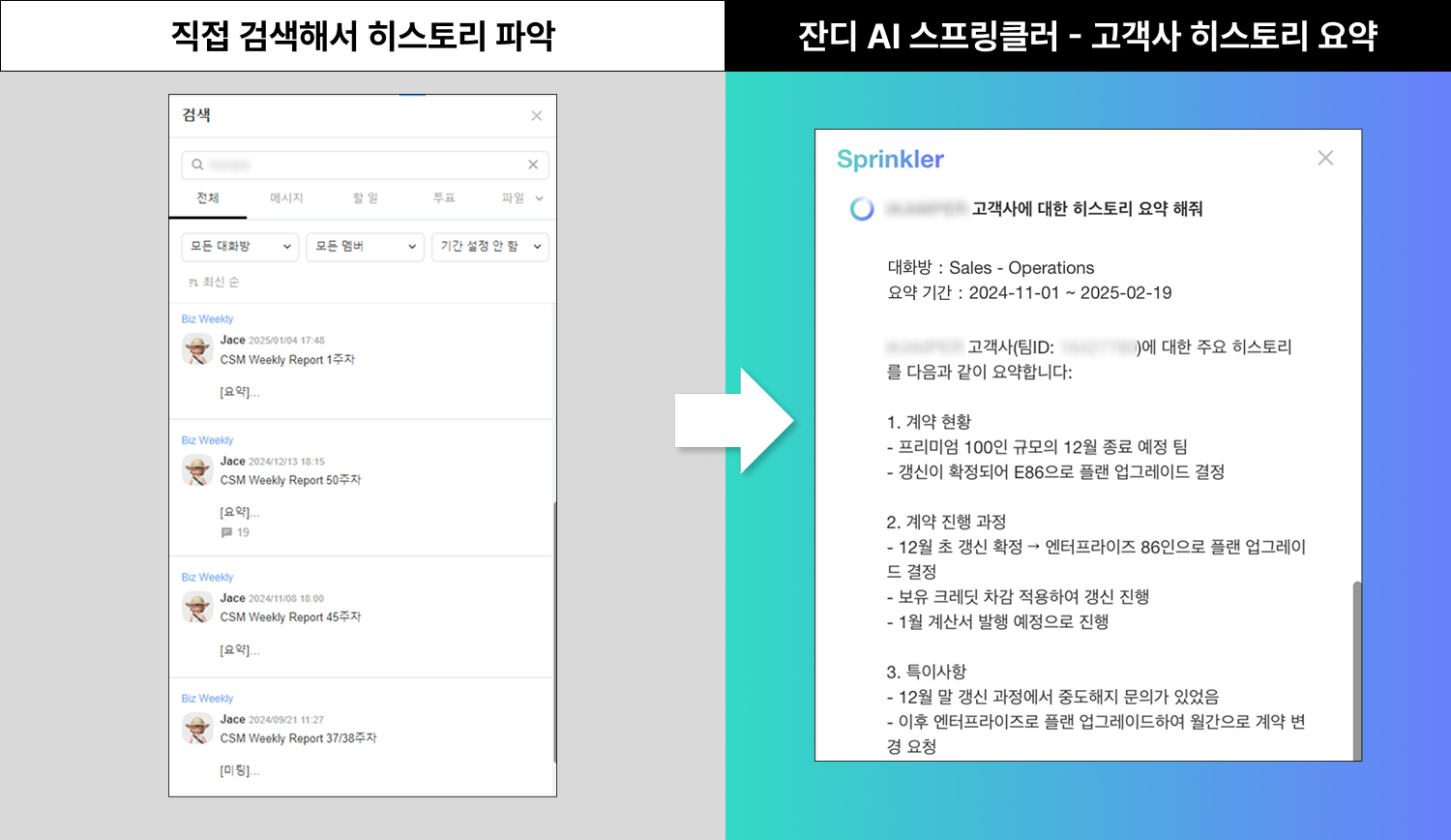 - 스프링클러 사용 전: 세일즈팀에게 고객사의 계약 유지는 매우 중요한 업무입니다. 과거에는 계약 해지가 예상되는 고객사가 있을 때마다 영업툴과 잔디에서 해당 고객과의 히스토리를 일일이 찾아야 했죠.