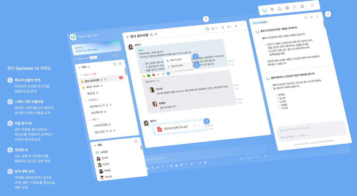 소통의 정확성을 높이는 잔디 AI (스프링클러)가 탑재된 잔디에는 대규모 언어 모델 LLM을 활용한 요약, 검색, 생성, 번역을 자유롭게 할 수 있는 것은 물론, 자연어로 AI와 상호작용하며 가치 있는 정보를 빠르게 재생산할 수 있습니다. 사용자는 AI가 생성한 답변을 메시지로 활용하거나 편집해서 내용을 완성할 수 있어요. 또한, 사내 정보를 잔디 내 별도 드라이브에 업로드 해 두고 흩어진 문서 내 정보를 통합적으로 검색하는 RAG 기반의 ‘지식 베이스’ 기능도 포함합니다.