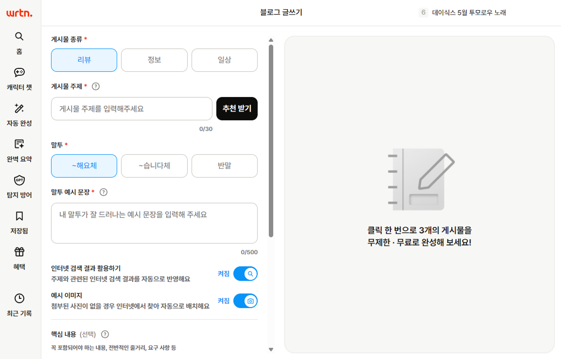 한국어에 최적화된 AI로 한국 사용자의 표현에 맞는 자연스러운 결과물을 생성하고 다양한 콘텐츠 템플릿을 제공합니다.