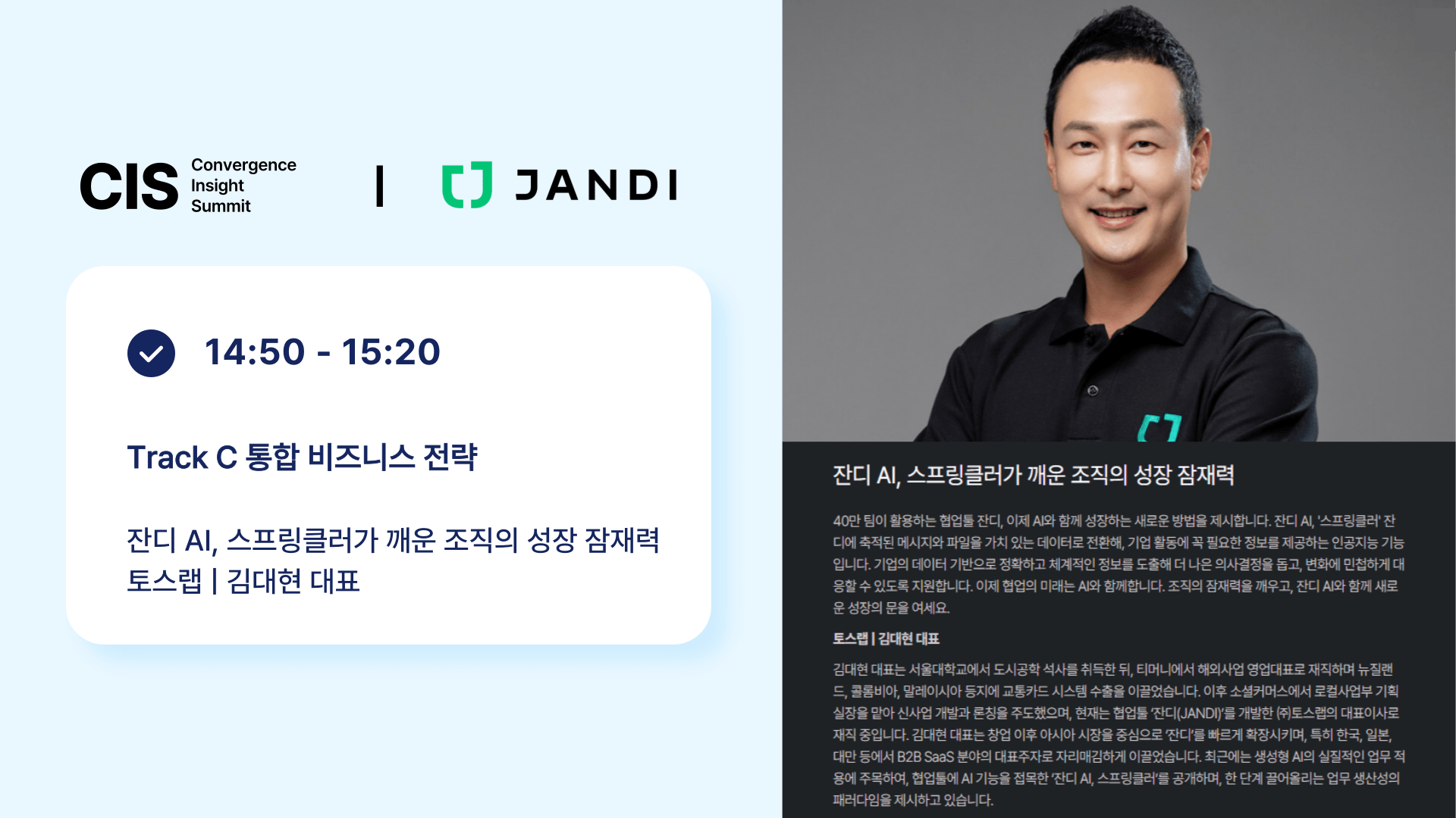 이상적인 업무 환경이란 과연 무엇일까요? 빠르게 변화하는 업무 환경에 맞춰 잔디 김대현 대표가 직접 잔디 AI 스프링클러로 기업의 업무 방법을 혁신하는 방법을 소개합니다. 최근 업데이트된 RAG(검색증강생성) 기반의 지식 베이스 기능을 포함해 다양한 기업의 잔디 AI 실사례를 발표를 통해 공개합니다. 많은 기대 부탁드리며, CIS 행사에서 잔디 부스와 발표 세션을 통해 만나 뵙겠습니다 🌱