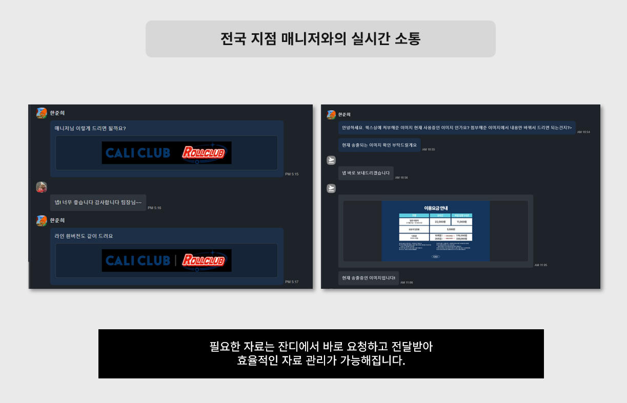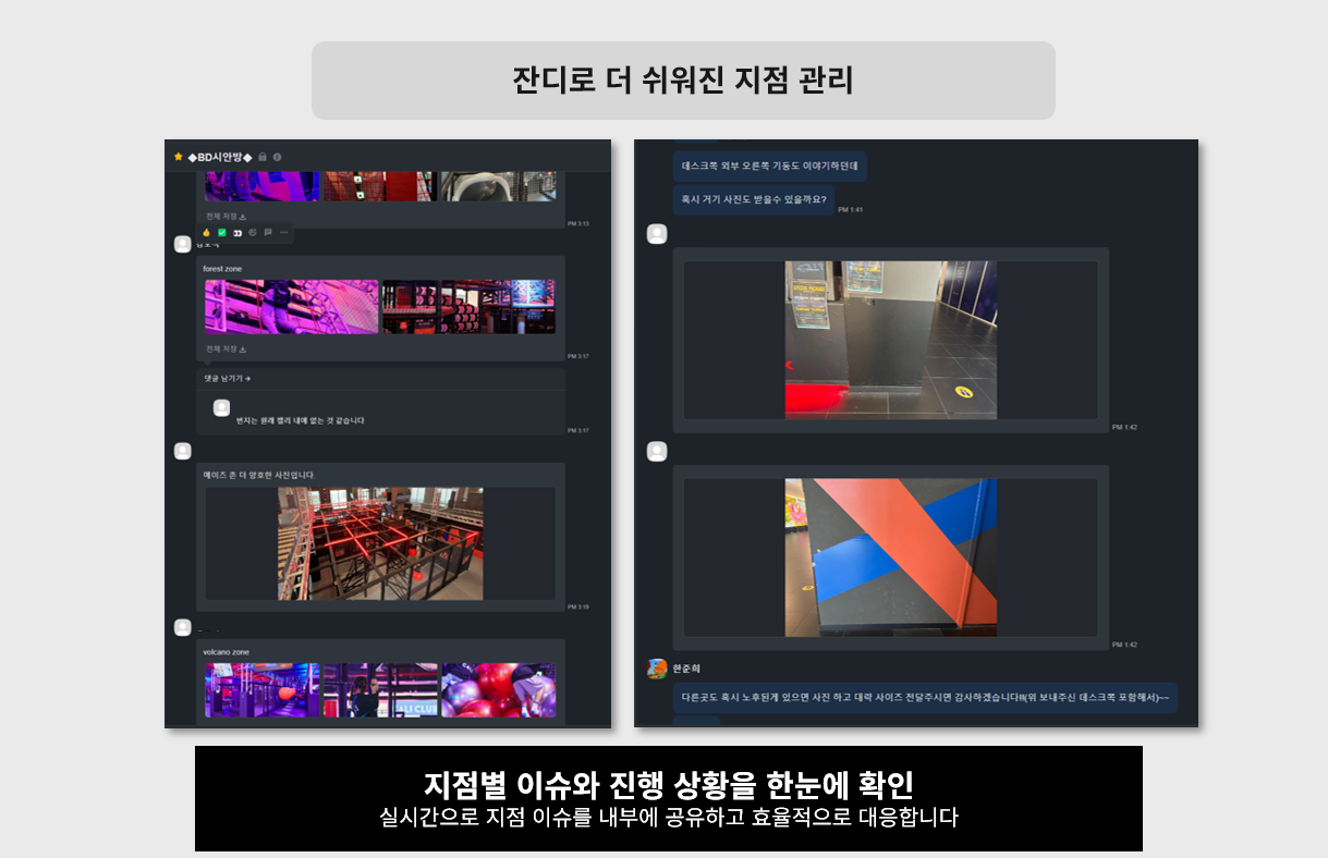 기존 매장 관리와 더불어 신규 매장 기획까지, 운영 중인 지점을 전반적으로 관리하기 위해 잔디를 적극 활용하고 있어요. 각 지점의 이슈나 운영 상황을 실시간으로 잔디에 공유함으로써 본사와 현장 간의 커뮤니케이션 속도를 높였고, 필요한 이미지 파일이나 관련 자료도 대화방에 바로 업로드하고 모두가 확인하면서 업무 공유가 훨씬 수월해졌습니다.