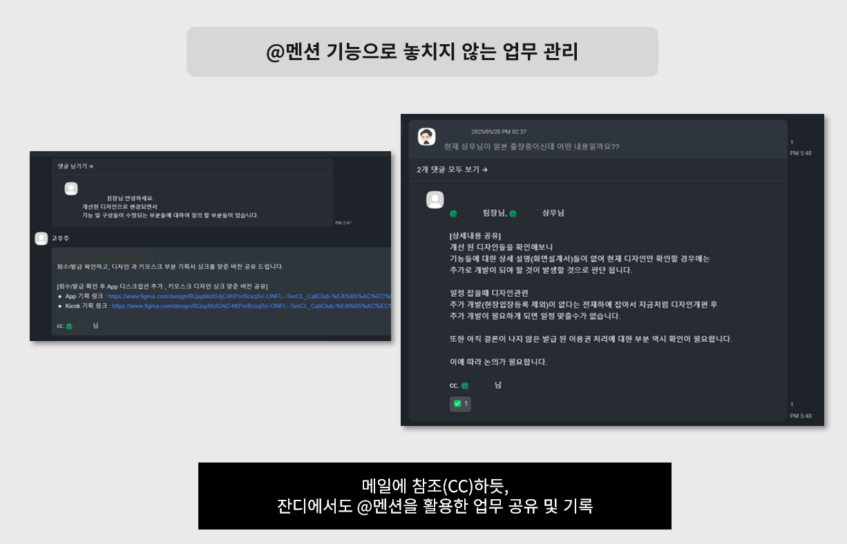 - 멘션 기능을 통해 담당 멤버에게 업무를 빠르게 전달하고, 본인이 전달받은 업무를 관리합니다.