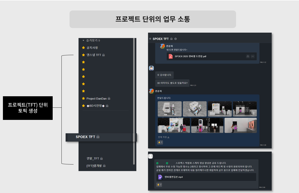 저희는 프로젝트 단위의 업무가 실시간으로 진행되기 때문에, 토픽과 그룹 채팅을 적극적으로 활용하고 있습니다. 특히 외부 협업이나 프로젝트별로 생성된 수많은 토픽과 채팅에서 업무가 오가는 만큼, 담당자가 제때 확인하고 반영하는 것이 매우 중요한데요.