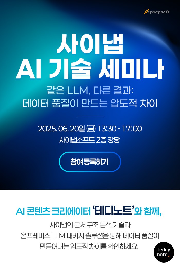 다가오는 6월 20일 (금), 잔디 팀이 참여하는 사이냅소프트 주관 사이냅 AI 기술 세미나에 초대합니다. AI 콘텐츠 크리에이터 ‘테디노트’, 사이냅소프트 문서모델팀 박민호 이사, 사이냅소프트 문서 AI팀 이재승 팀장 그리고 토스랩 잔디 서준호 CTO가 데이터 품질로 변화하는 업무 환경에 대한 AI 인사이트를 전달합니다. 사이냅이 수년 간 쌓아온 디지털 문서 분야의 전문성을 바탕으로 사이냅소프트 도큐애널라이저 (DA)와 AI 협업툴 잔디로 더 향상되는 지능형 업무 환경이 궁금하신 분들의 많은 신청 부탁드립니다!