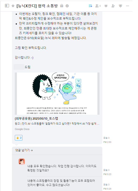 잔디 팀은 뉴닉과 협업하며 콘텐츠를 제작하는 과정에 있어서도 만족스러운 경험을 했어요. 뉴닉 측에 전달한 홍보 요청 자료를 기반으로 기획안을 전달 받을 수 있었는데요. 잔디 내 협력 소통방 토픽을 통해 기획안 수정·보완을 진행했습니다. 필요한 자료를 제때 주고받으며 실시간으로 원활한 협업이 이루어진 덕분에 양질의 콘텐츠가 탄생할 수 있었습니다.