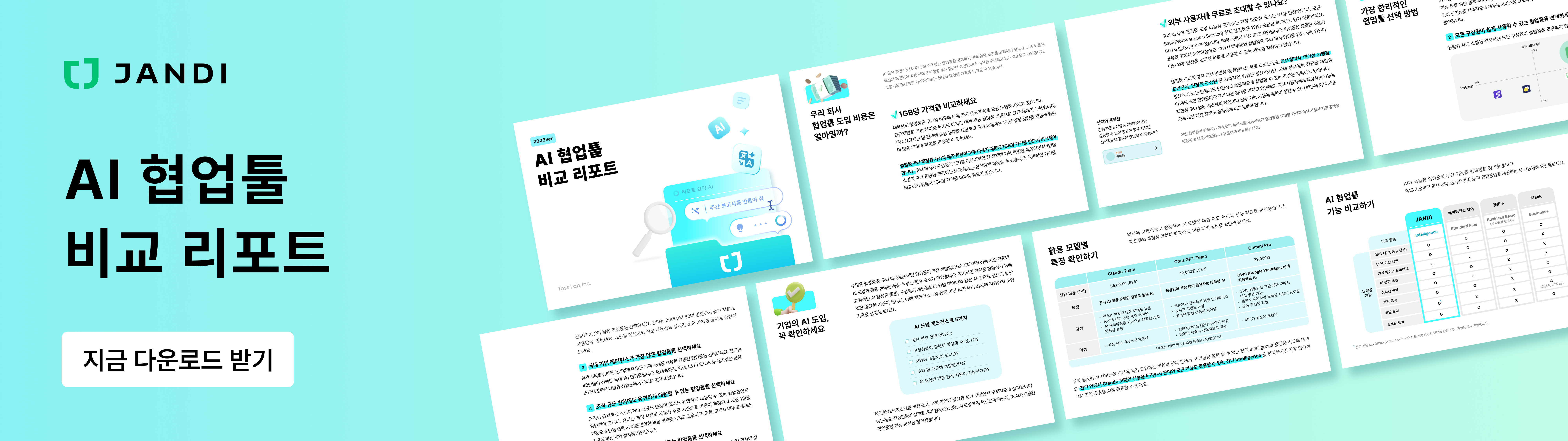 이제 여러 선택지 중 AI 도입과 활용 전략은 빠질 수 없는 필수 요소가 되었습니다. 이번 리포트에는 어떤 AI가 우리 회사에 적합한지 확인할 수 있는 도입 기준 체크리스트와 업무에 보편적으로 활용하는 Claude, Chat GPT, Gemini 와 같은 AI 활용 모델의 주요 특징과 가격, 성능을 비교·분석했습니다. 뿐만 아니라, 실질적인 협업툴 도입 검토에 활용할 수 있는 AI가 적용된 협업툴 (잔디, 네이버웍스, 플로우, 슬랙) 간의 AI 기능과 각 협업툴별 가격 경쟁력 비교 자료도 리포트에서 확인할 수 있어요.