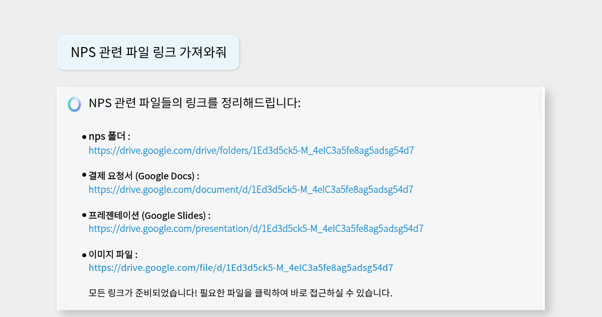 MCP를 등록해두시면, 잔디 홈에서 구글 드라이브 파일을 편리하게 확인하고, 필요한 파일을 발견하면 즉시 공유 링크를 생성하여 팀원들과 빠르게 공유할 수 있습니다. 이제 더 이상 여러 창을 오갈 필요 없이 잔디 안에서 모든 자료를 손쉽게 관리하며 업무 흐름을 끊김 없이 이어가세요!