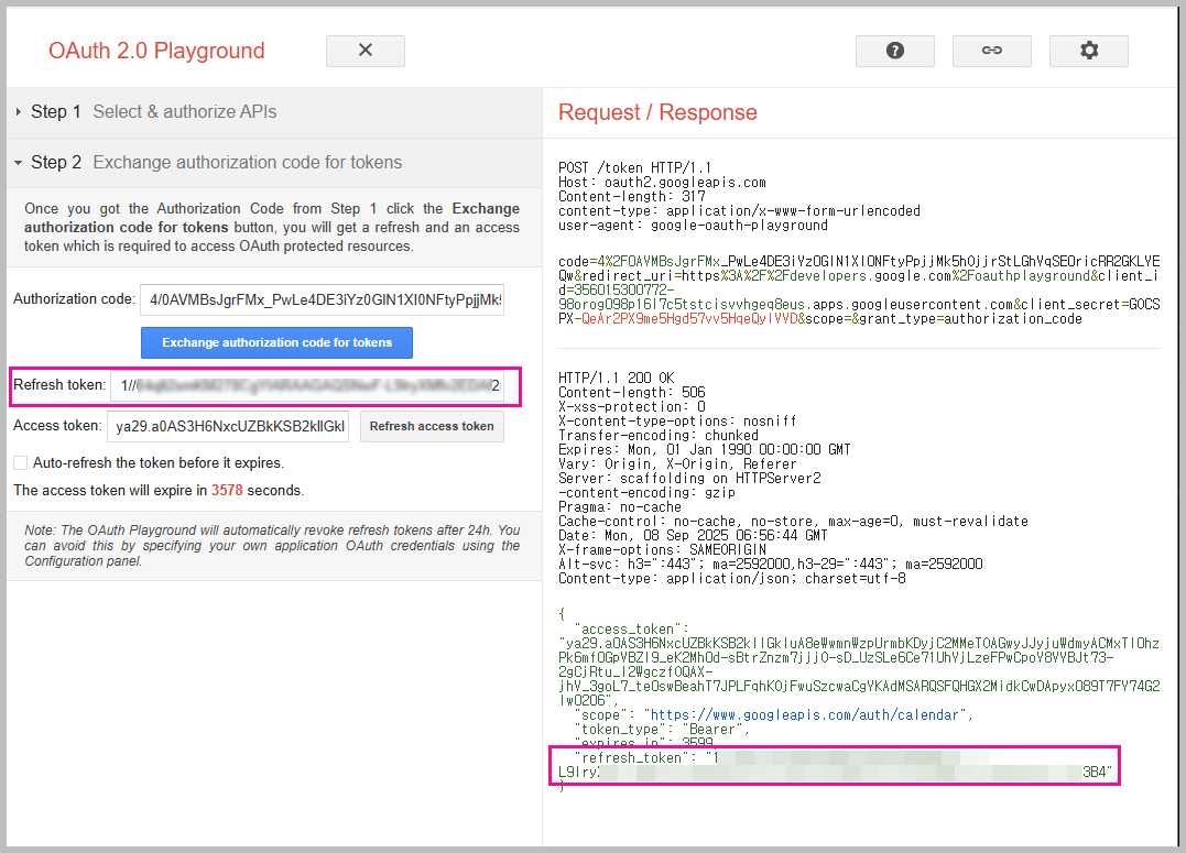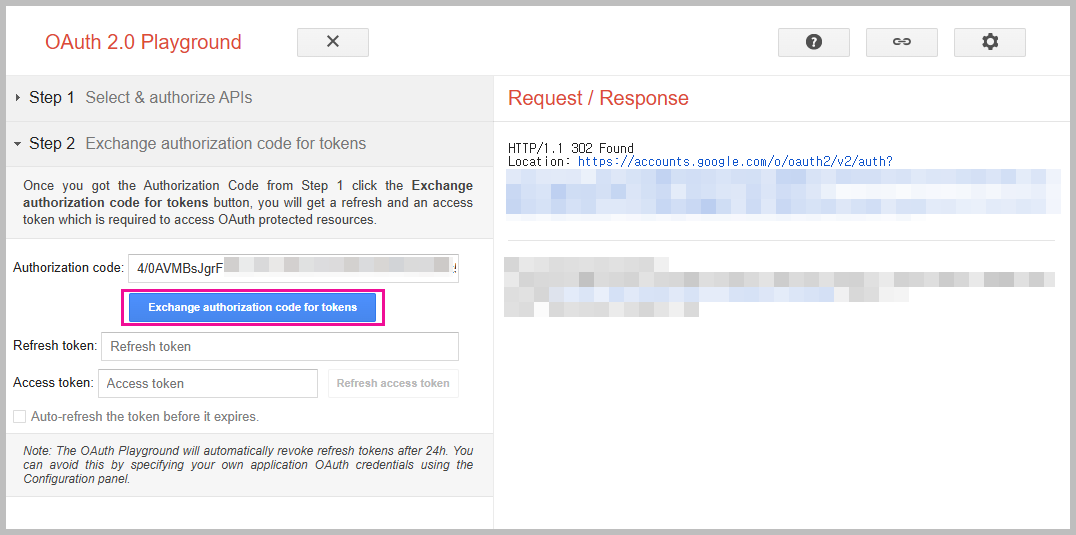 2-3) Step 2로 넘어가면 [Exchange authorization code for tokens]를 클릭해 주세요.