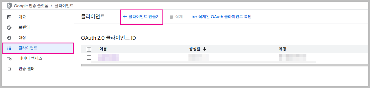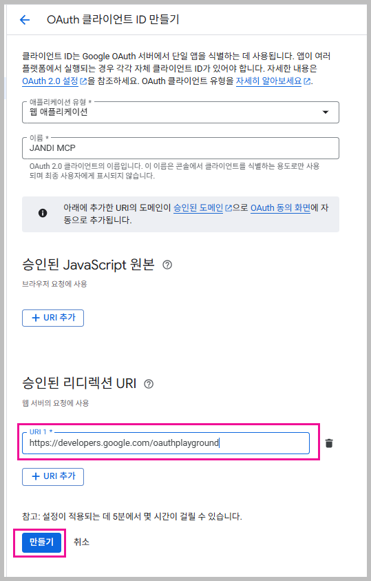 - 앱 이름을 설정하고, 승인된 리디렉션 URI에 아래 URL을 입력한 후, [만들기]를 진행해 주세요.