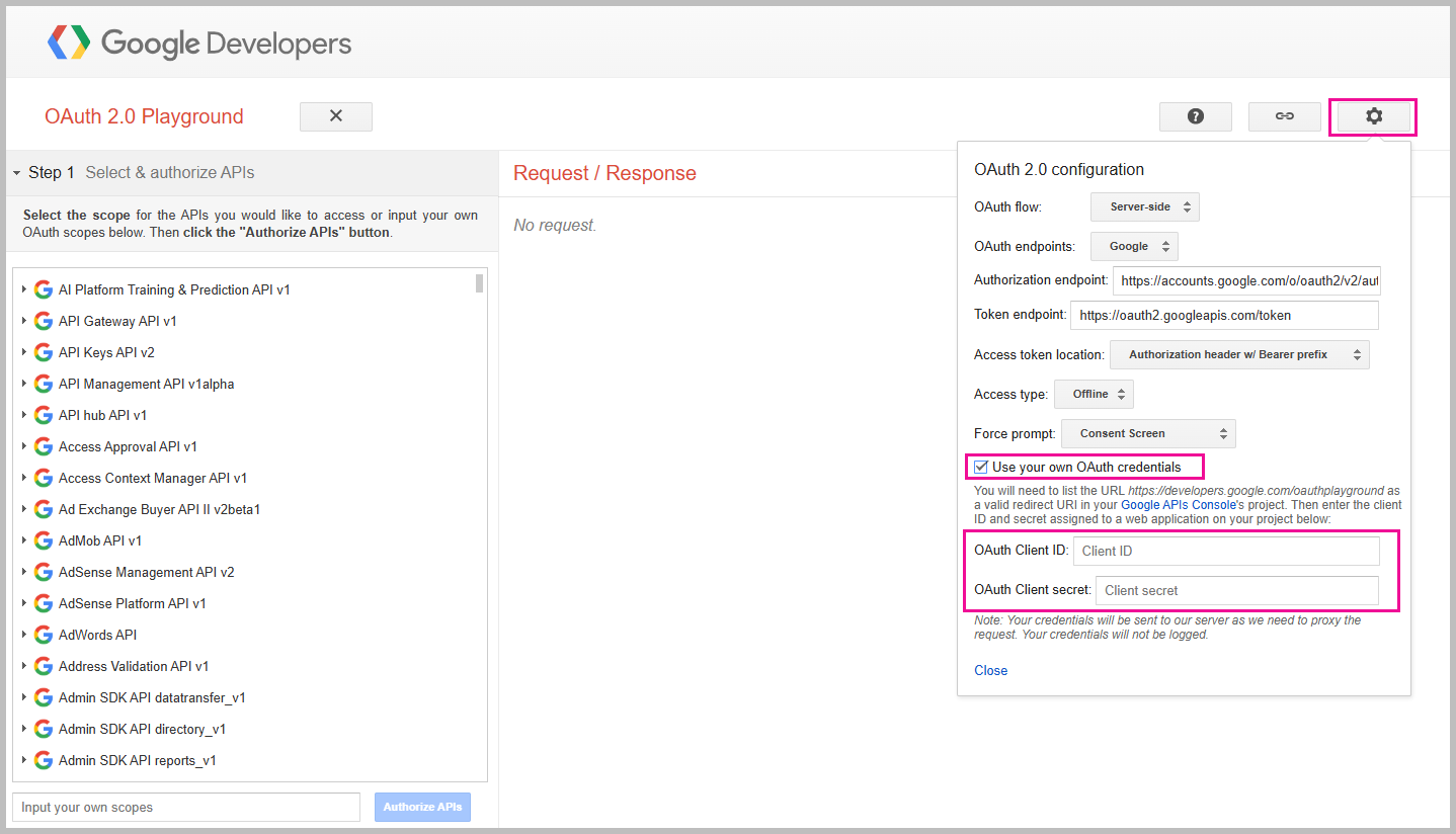 복잡한 코드 작성 없이 구글 API의 인증 과정을 직접 체험하고 테스트해 볼 수 있는 도구입니다.