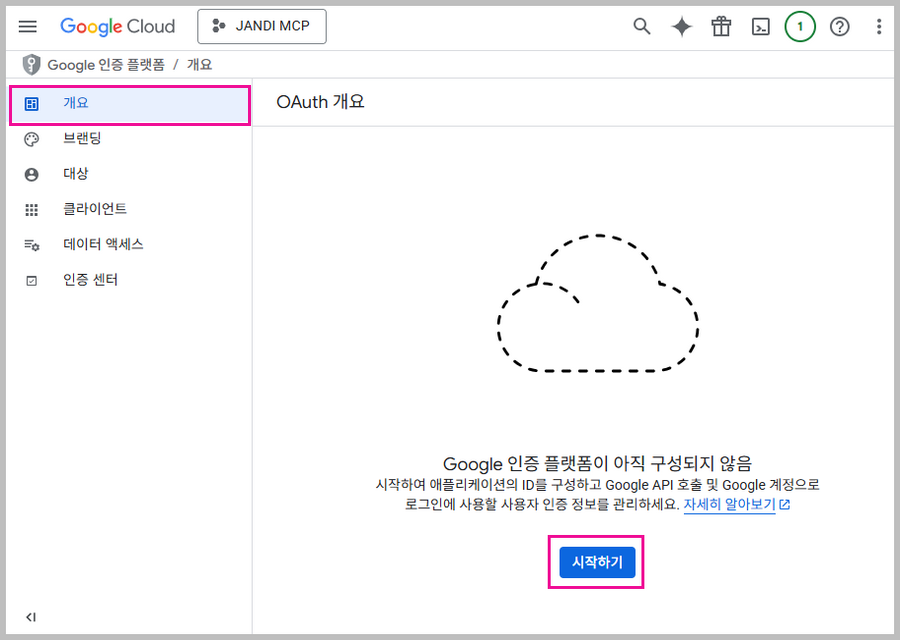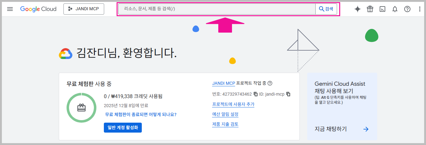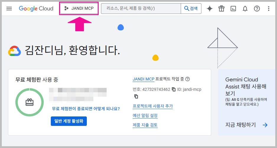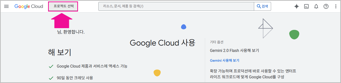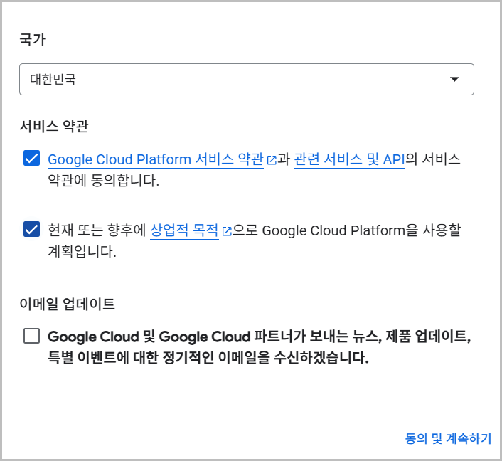 구글 클라우드를 처음 이용하는 경우, 서비스 약관 동의 과정이 필요할 수 있습니다.