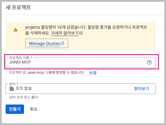 - 프로젝트 이름을 작성한 후, [만들기]를 클릭해 주세요.