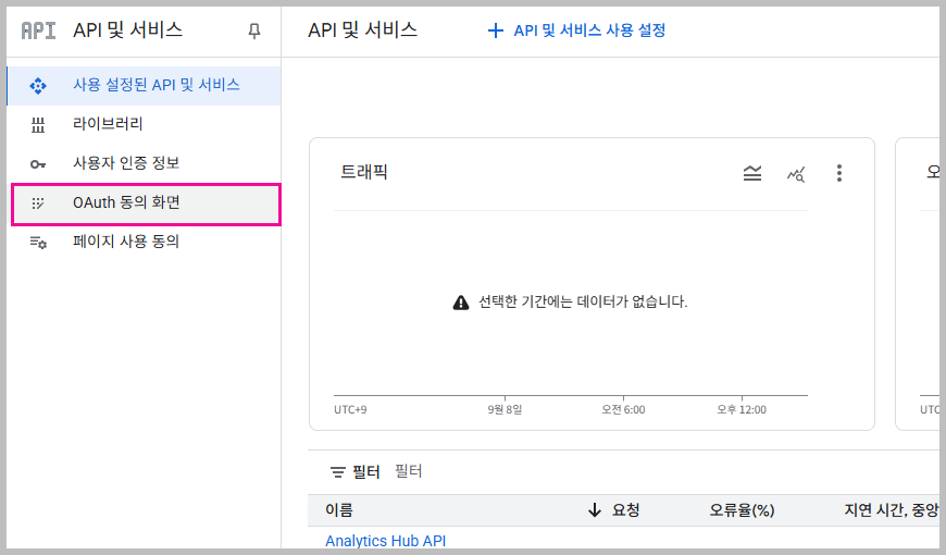 1-5) API 및 서비스 페이지가 열리면 좌측 메뉴에서 OAuth 동의 화면으로 이동합니다.