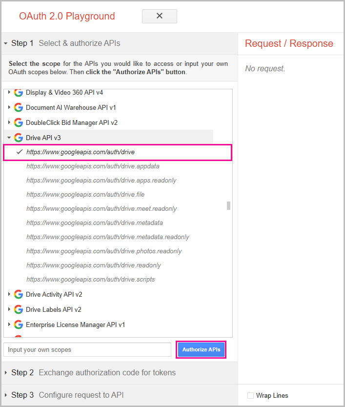 2-2) 좌측 Step 1 항목에서 “Drive API v3”를 클릭한 후, 가장 상위 링크를 선택한 후, [Authorize APIs]를 클릭해 주세요.