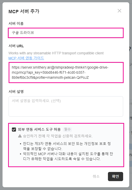4-2) MCP 서버 추가에 서버 이름, 서버 URL, 서버 설명을 작성해 주세요.