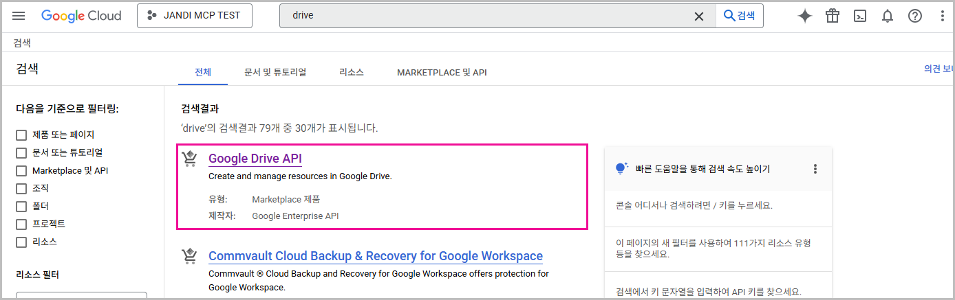 1-3) 상단 검색 창에 [Google Drive API]를 검색해 주세요.