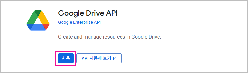 1-4) 검색 결과 중 Google Drive API를 선택한 후, [사용] 설정 버튼을 클릭해 주세요.