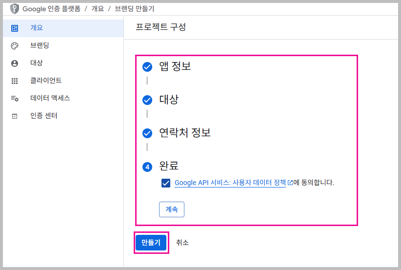 - [개요] > [시작하기]를 클릭한 후, 앱 정보, 대상, 연락처 정보를 입력하고 [만들기]를 진행해 주세요.