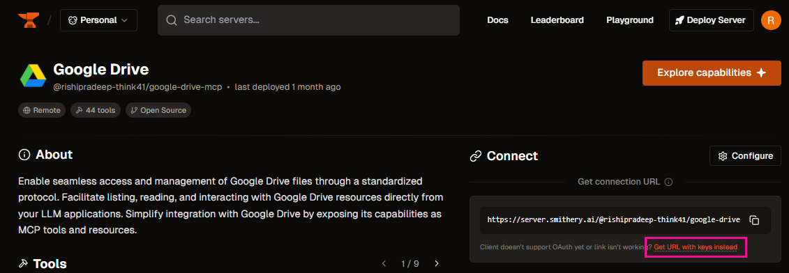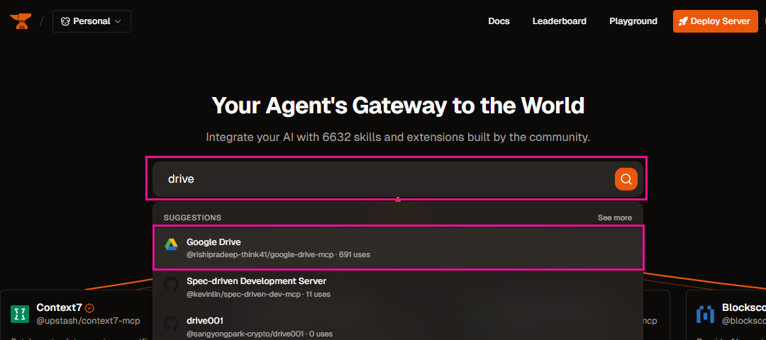 3-1) Smithery 페이지 상단 검색창에 [Drive] 입력 후, 가장 첫 번째 [Google Drive] 를 선택해 주세요.