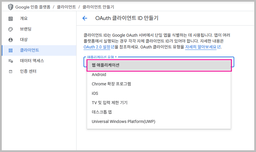1-7) 클라이언트 > [+ 클라이언트 만들기] 를 클릭한 후, 애플리케이션 유형을 [웹 애플리케이션]으로 선택해 주세요.