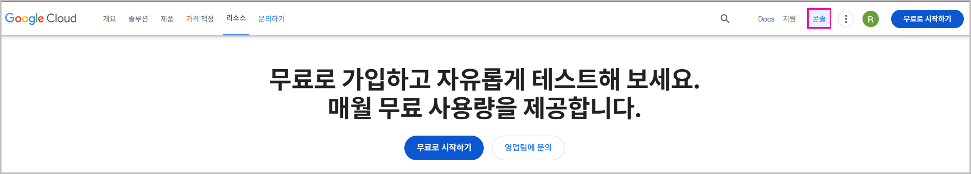 구글 클라우드 페이지에 접속하신 후, 화면 우측 상단에 있는 ‘콘솔’ 버튼을 클릭하여 로그인해 주세요.
