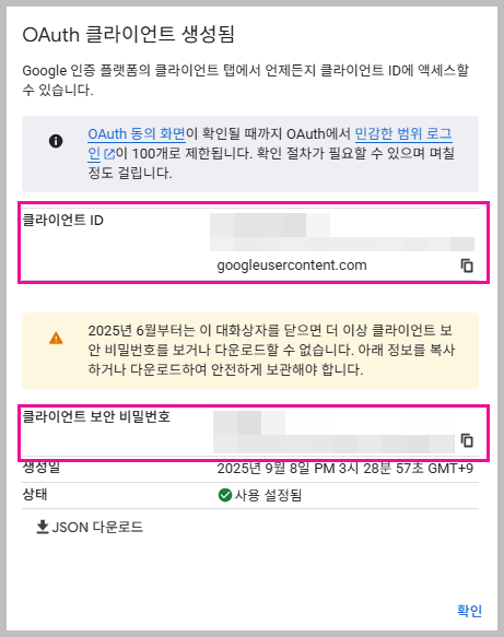 1-8) 생성된 OAuth 클라이언트의 클라이언트 ID와 클라이언트 보안 비밀번호를 별도로 기록하여 안전하게 보관해 주세요. (⚠️클라이언트 보안 비밀번호는 재확인이 어렵습니다.)