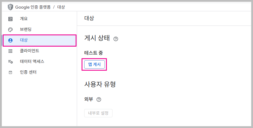 (앱 게시는 사용자 유형이 ‘외부’로 설정된 경우에만 가능합니다.)