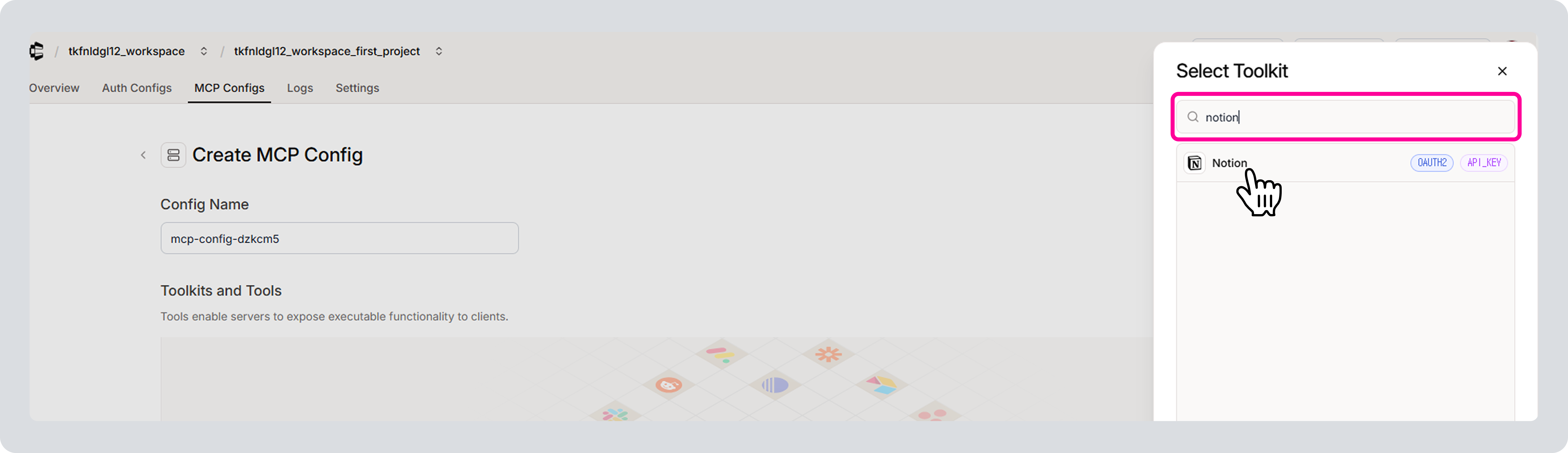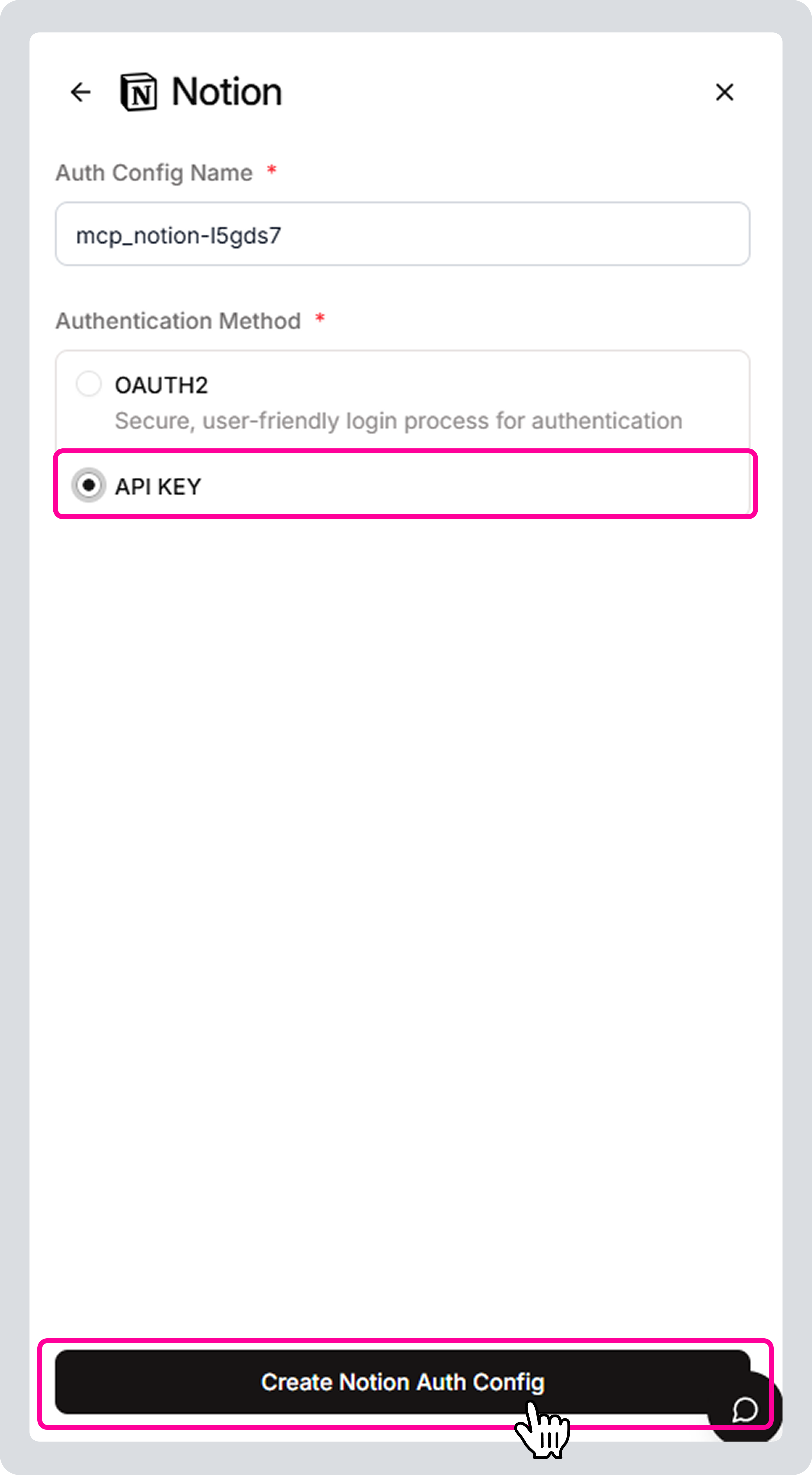 2-5) ‘Authentication Method’를 API KEY로 선택한 후, ‘Create Notion Auth Config’를 클릭해 주세요.
