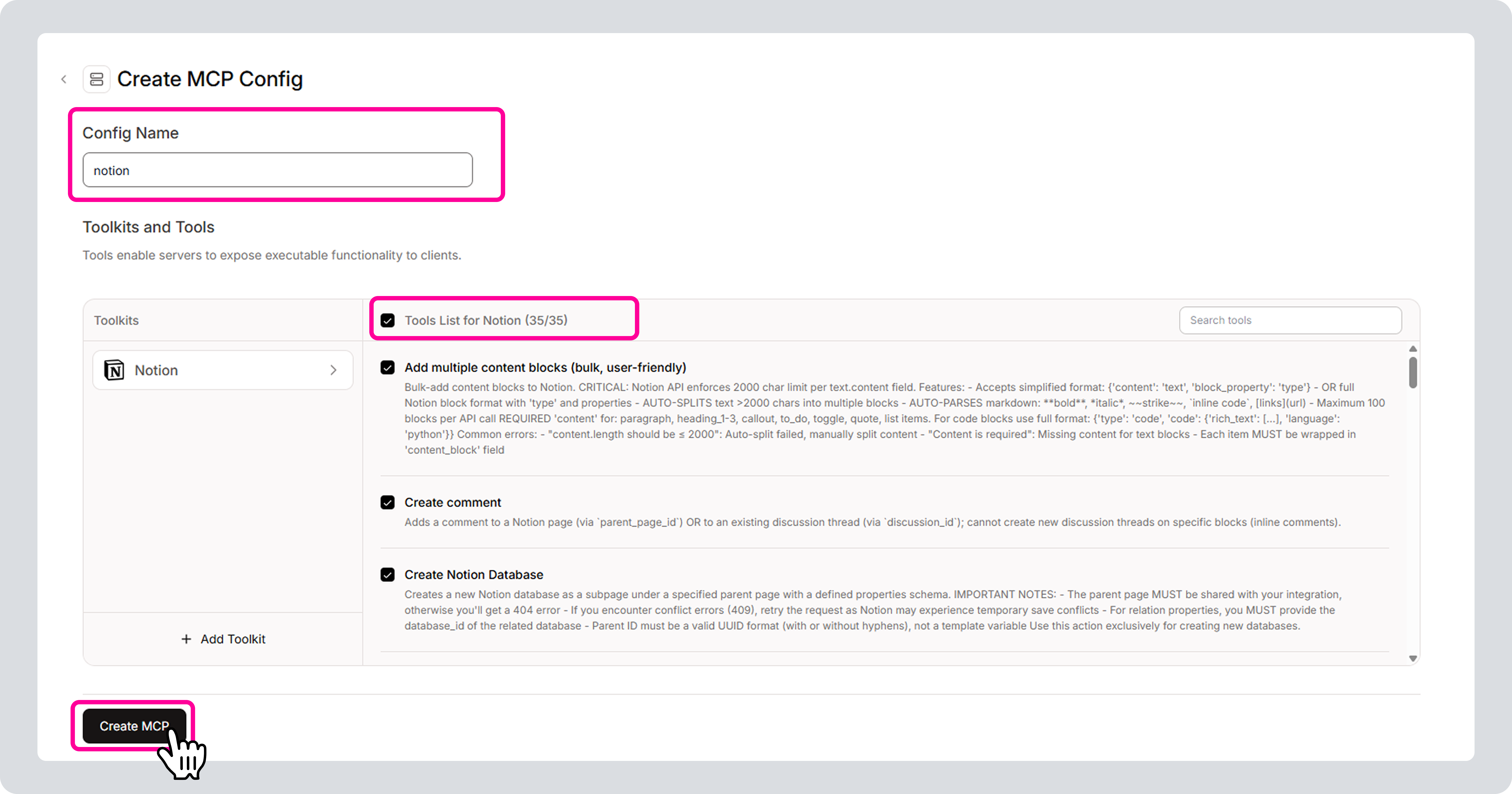 2-6) Config Name을 notion으로 변경한 후, ‘Tools List for Notion’를 클릭하여 모든 도구 목록을 활성화하고, 하단 Create MCP 버튼을 클릭해 주세요.