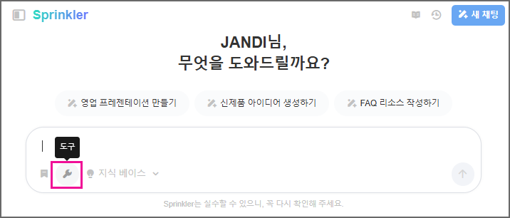3-1) 좌측 상단 잔디 [홈] 에서 AI 메시지 입력창에 [도구]를 클릭해 주세요.