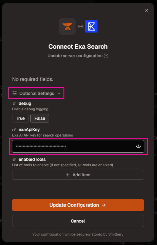 2-3) OptionalSettings를 클릭한 후, exaApiKey에 (1-3)에서 저장한 API키를 붙여넣고 [Update Configuration] 을 선택해 주세요.