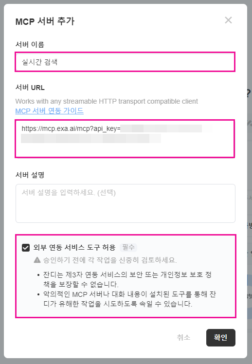 3-3) MCP 서버 추가에 서버 이름, 서버 URL, 서버 설명을 작성해 주세요.