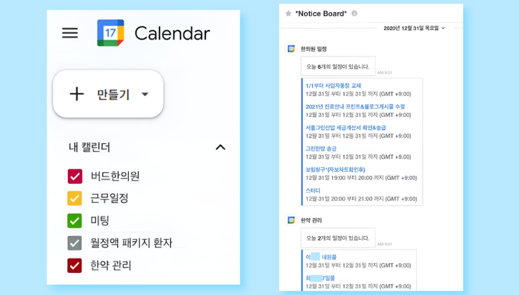 매일 아침 8시마다 그 날 전체 일정이 자동으로 알림 받을 수 있도록 한의원 공용 구글 캘린더와 잔디 ‘공지사항’ 토픽을 연결했습니다.