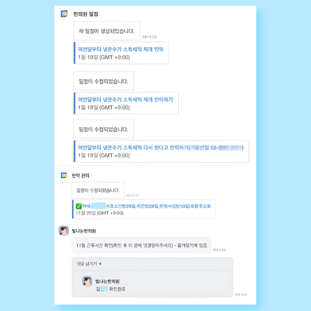 매일 아침 8시마다 그 날 전체 일정이 자동으로 알림 받을 수 있도록 한의원 공용 구글 캘린더와 잔디 ‘공지사항’ 토픽을 연결했습니다.