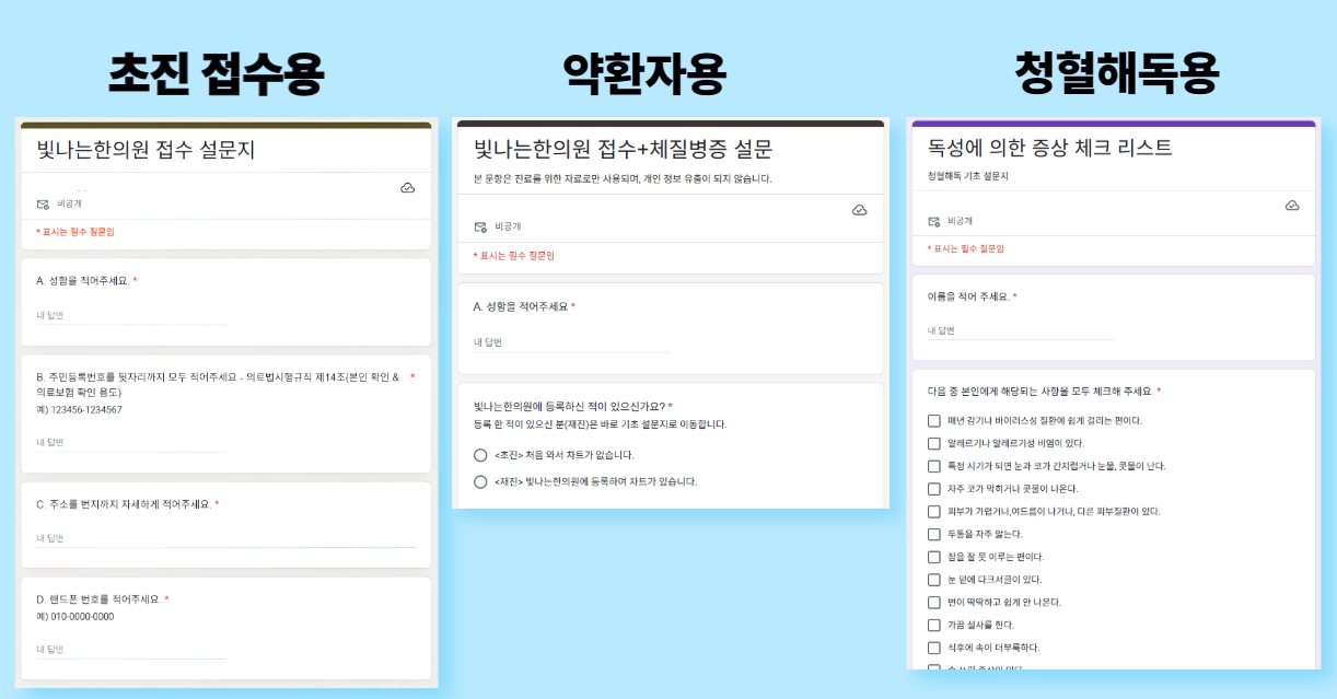 아래 설문지를 환자가 작성하면, 자동으로 연동되어 잔디에 메시지 알림이 뜨고 메시지를 복사에서 차트에 붙이는 방법으로 연동했습니다.