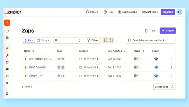 빛나는 한의원 팀의 실제 Zapier 연동 목록 3가지를 공개합니다.
