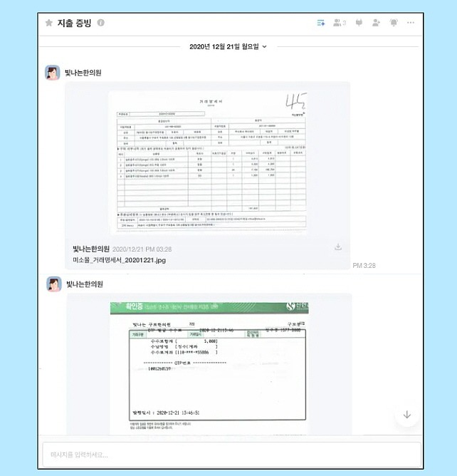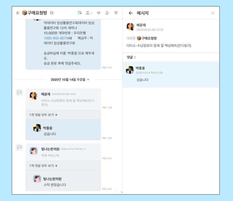 물품 구매가 필요하면, 누구나 자유롭게 메시지로 요청하고 담당자가 구매해서 댓글로 기록 공유할 수 있습니다.