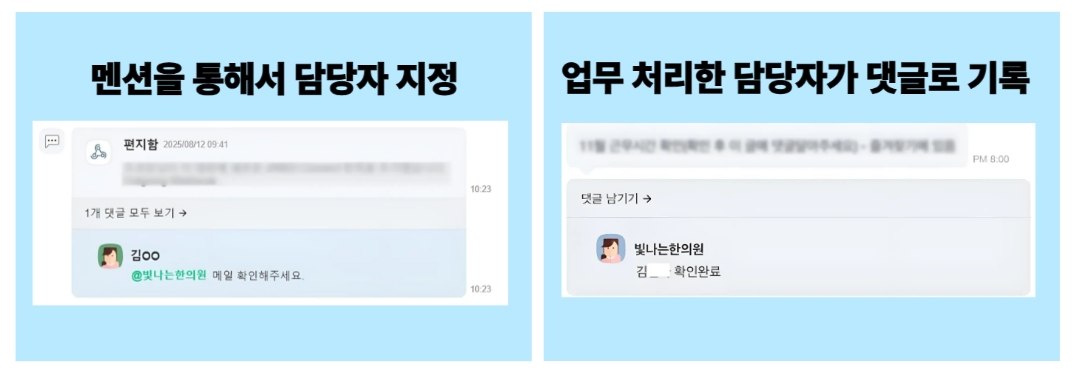 이미지와 같이 멘션을 통해서 담당자를 지정하고, 할 일 등록으로 업무를 기록하고, 업무 처리한 담당자가 댓글로 기록하는 방식으로 관리하면, “아, 그거 처리했나?” 하는 일이 없어집니다.