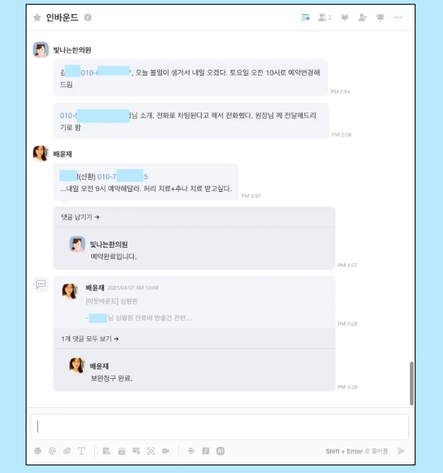[인바운드] 수신 전화와 [아웃바운드] 발신 전화를 각각 메시지로 기록하고, 댓글로 업무 처리해서 향후 업무 진행 사항을 추적할 수 있습니다.