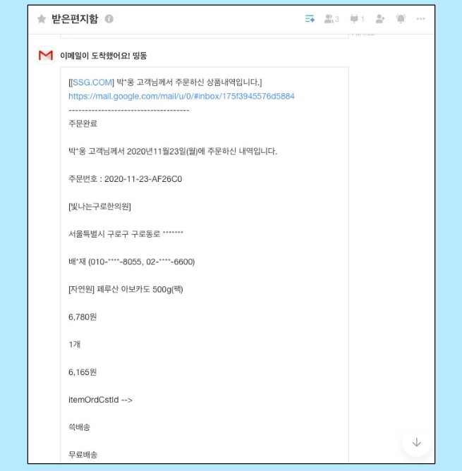 한의원 이메일이 오면 바로 잔디 ‘받은편지함’ 토픽에 알림이 옵니다.
