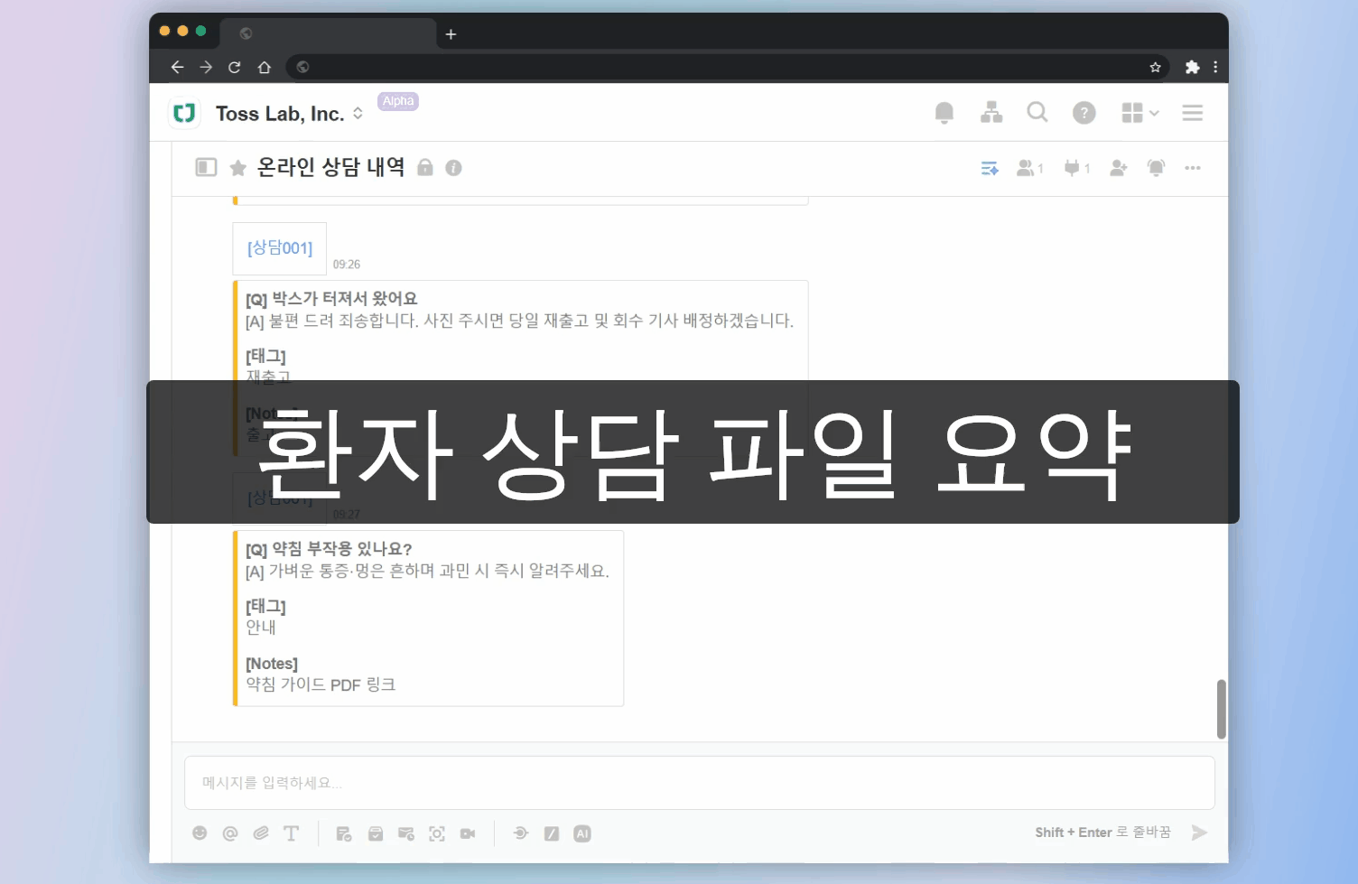 고객 상담 내역을 잔디 토픽에 연결해 두거나 상담 내역 파일을 잔디에 업로드해 두었습니다. 잔디 AI 기능인 [대화방 요약] 또는 [파일 요약] 기능을 사용해서 환자와의 상담 데이터를 요약 분석할 수 있습니다.