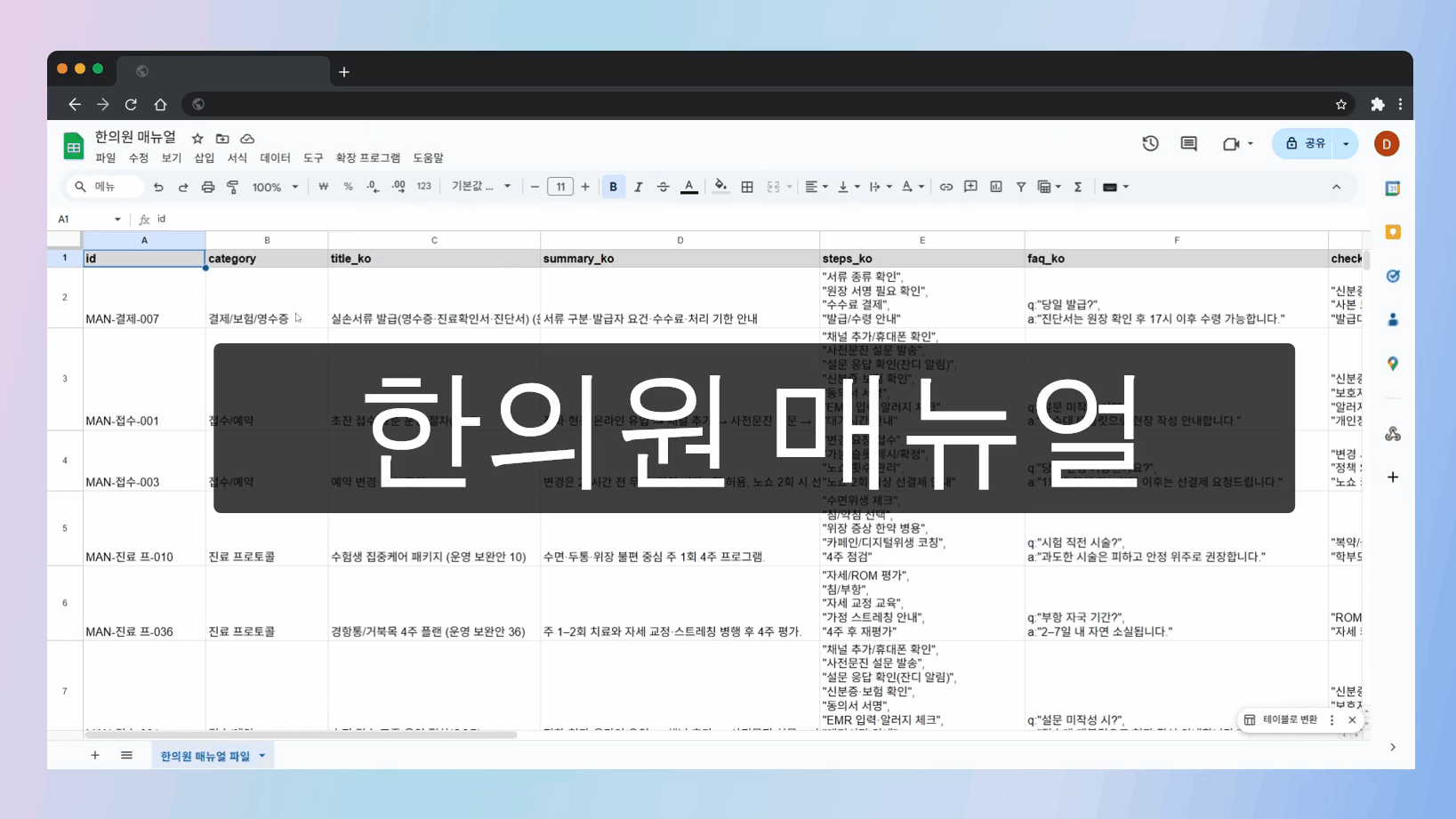 매뉴얼을 숙지하지 않은 상황에서도 환자의 돌발 질문에 응대할 수 있도록 한의원 매뉴얼 파일을 잔디 지식베이스 드라이브에 업로드 해 두었어요.