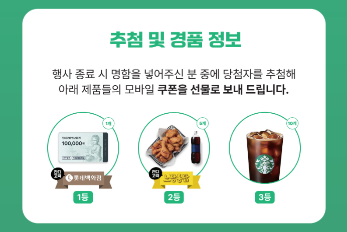 뿐만 아니라, 잔디 부스에 방문해 주시는 분들을 대상으로 명함 이벤트도 진행했는데요. 명함을 넣어주신 분 중 당첨자를 추첨하여 잔디의 소중한 고객사 경품을 준비했어요. 1등은 롯데백화점 상품권, 2등은 노랑통닭, 3등은 스타벅스 커피 상품권이었습니다. 어떤 기준으로 당첨자를 추첨했는지 아래에서 자세히 소개할게요!