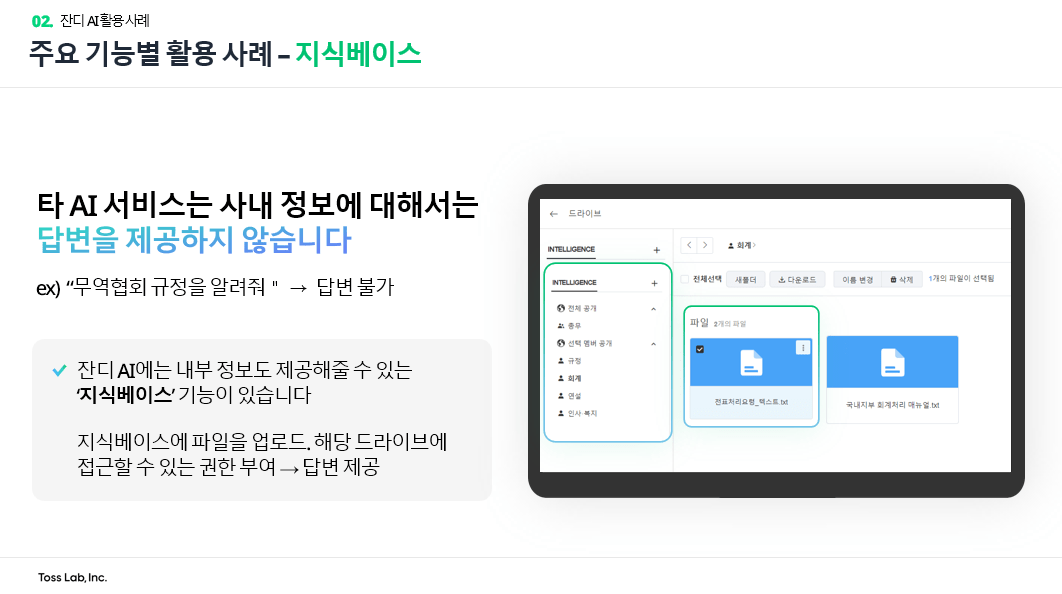 그 중에서도, 내부 정보를 지원하는 ‘지식 베이스(KB)’ 기능을 가장 잘 활용하고 있다고 강조해 주셨습니다. 사내 정보에 대해서는 답변을 제공하지 않는 타 AI 서비스와는 다르게, 잔디 AI는 RAG 기반 기술을 적용해 해당 기능을 제공하고 있기 때문입니다. 우리 회사 내부 정보를 지식베이스 드라이브에 업로드해 두면, 잔디 AI가 사내 정보를 기반한 질문에도 해당 정보를 토대로 빠르게 답변을 도출해 줍니다.