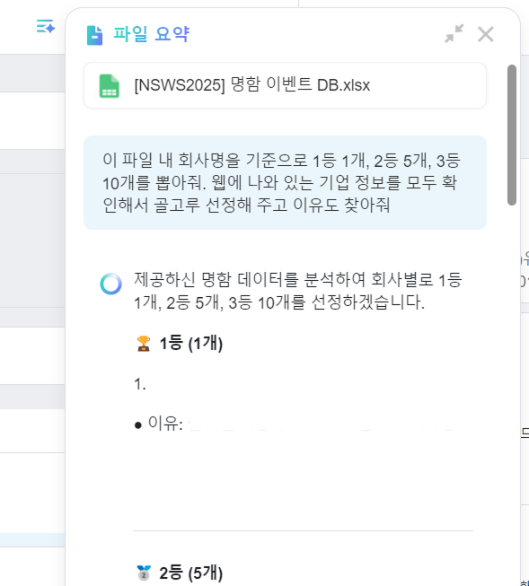 잔디 팀은 명함 이벤트 당첨자를 아주 공정하게 잔디 AI, 스프링클러로 추첨했습니다. 정리된 명함 DB가 들어있는 파일에서 잔디 AI의 파일 분석 기능을 통해 아래와 같이 요청했어요.